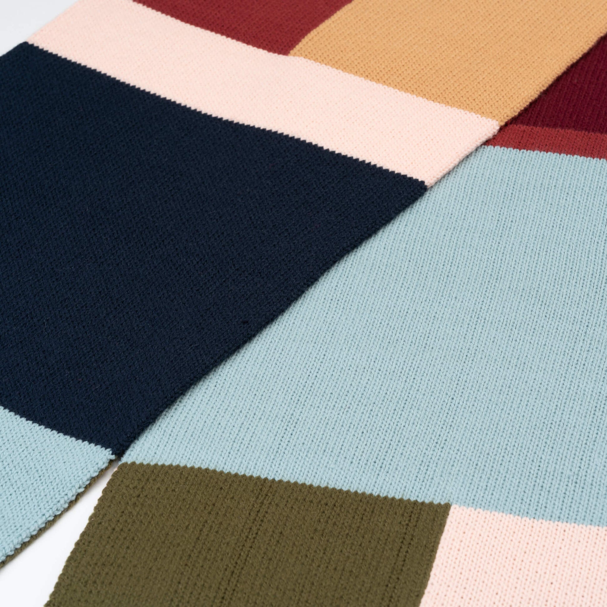 Oversized, soft jacquard knit scarf with modern, architectural colorblocking. Layer on the color with this big, comfy, cozy scarf all fall and winter long. Can be worn long or wrapped up like a cowl for extra warmth. Fully reversible. Made with hypoallergenic yarn.