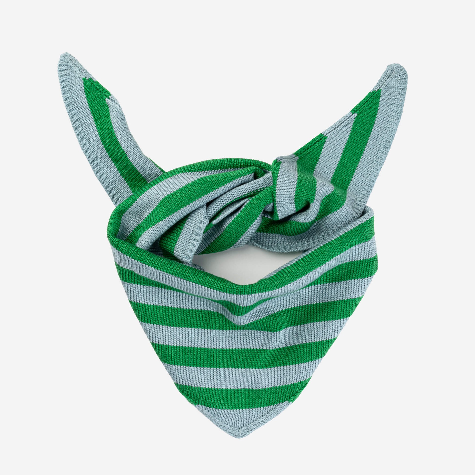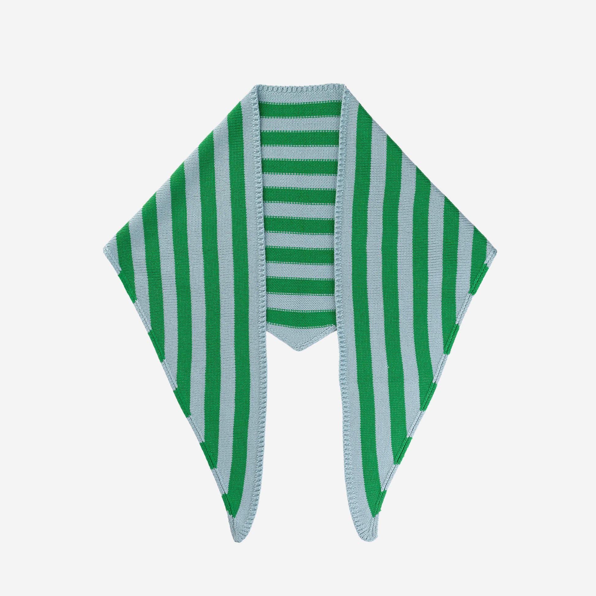Soft, versatile triangle scarf with two-tone simple striping. Wear it knotted or tied as a neckerchief, shawl, or bandana. Perfect for transitional outfits, indoors and out. Knit with hypoallergenic yarn.